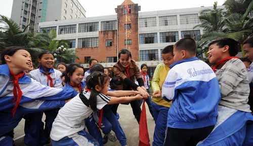 河口城區(qū)小學(xué)的學(xué)生在課后進(jìn)行拔河比賽