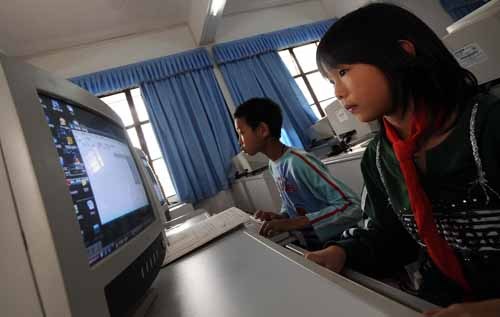 河口城區(qū)小學(xué)的六年級學(xué)生梁紅霞(右)在計(jì)算機(jī)課上學(xué)習(xí)打字
