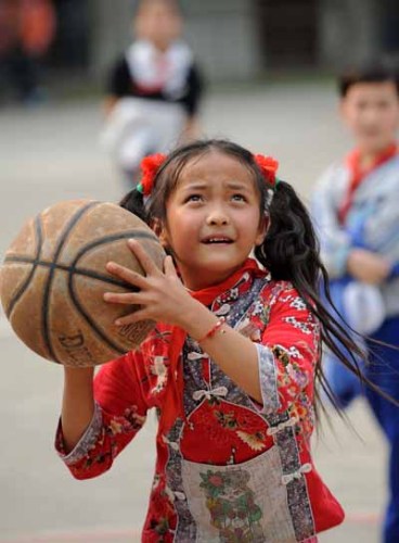 河口城區(qū)小學(xué)的一名女學(xué)生在課后玩籃球