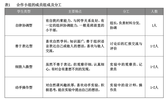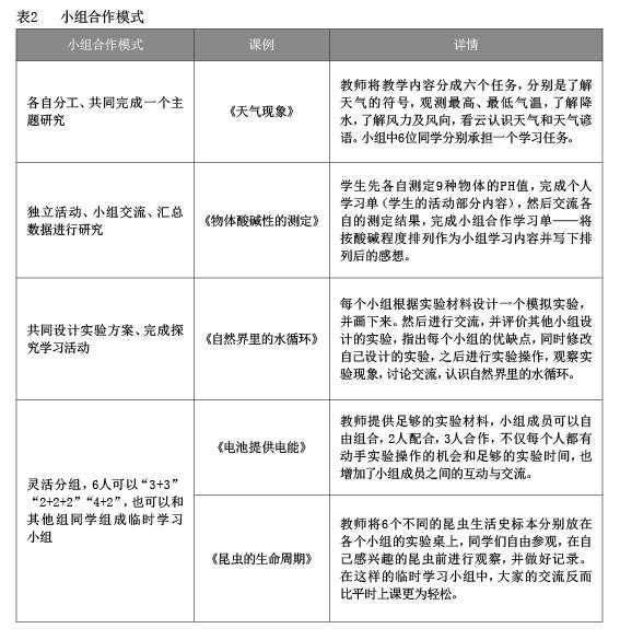 70-85分鐘的自然課不僅可以保障較完整的探究過程,還給學生合作提供了時間。我們在自然長課時教學中開展小組合作學習,根據(jù)“組內(nèi)異質(zhì)、組間同質(zhì)”原則組建4-6人學習小組(參見表1),形成小組合作學習共同體。小組合作模式多樣(參見表2),交流充分。