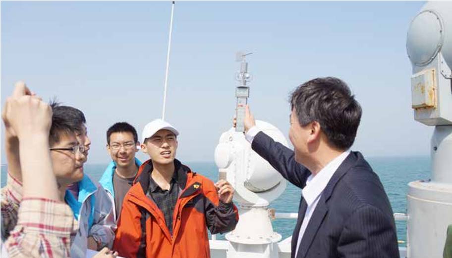 ☉ 青島39中海洋班學(xué)生和白剛勛校長(zhǎng)一起進(jìn)行海上科考實(shí)驗(yàn)