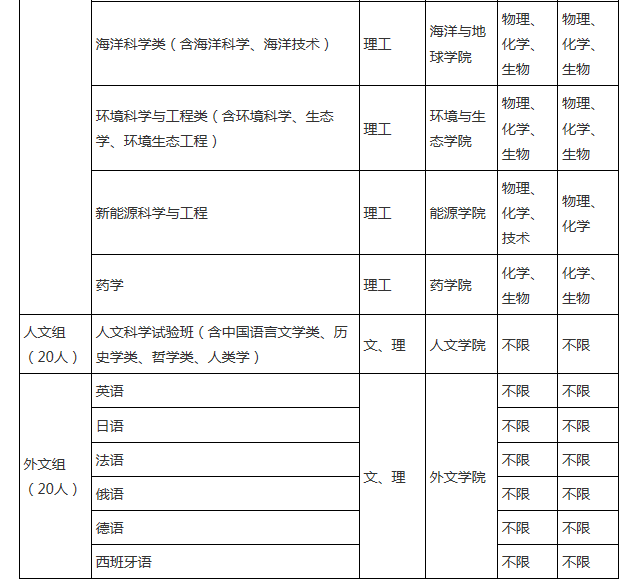 我校設(shè)置數(shù)學(xué)、物理、化學(xué)、生物學(xué)、信息學(xué)、人文、外文七個(gè)學(xué)科考核組別,并按照七個(gè)學(xué)科考核組確定參加考核名單和入選資格考生人數(shù)。各考核組別招生計(jì)劃及相關(guān)相近專業(yè)(類)詳見(jiàn)廈門大學(xué)2017年自主招生計(jì)劃表。我校將根據(jù)實(shí)際報(bào)考生源情況微調(diào)各考核組別招生計(jì)劃。