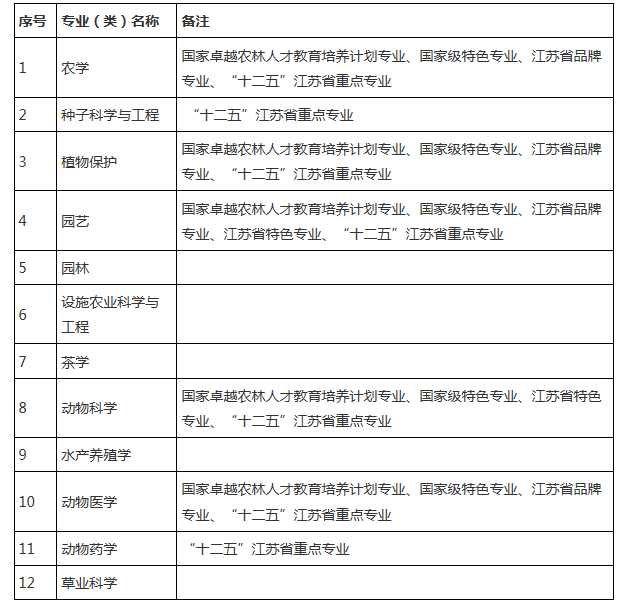 農(nóng)學、種子科學與工程、植物保護、園藝、園林、設施農(nóng)業(yè)科學與工程、茶學、動物科學、水產(chǎn)養(yǎng)殖學、動物醫(yī)學、動物藥學、草業(yè)科學。