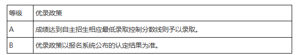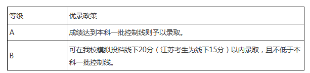 我校對(duì)取得自主招生認(rèn)定資格的考生依據(jù)測(cè)試結(jié)果給予相應(yīng)的優(yōu)錄政策。經(jīng)我校測(cè)試認(rèn)定為“優(yōu)秀”者享受A等優(yōu)錄政策,“合格”者享受B等優(yōu)錄政策,其中享受A等優(yōu)錄政策的人數(shù)比例不超過公示人數(shù)的40%。填報(bào)高考志愿時(shí),具體填報(bào)方式、填報(bào)時(shí)間等以生源所在地省級(jí)招生考試機(jī)構(gòu)規(guī)定為準(zhǔn)。填報(bào)專業(yè)志愿時(shí),應(yīng)填報(bào)公示入選專業(yè)。學(xué)校將根據(jù)入選資格考生自主招生志愿、高考成績(jī)總分、經(jīng)公示的優(yōu)惠分值、入選專業(yè)和學(xué)校模擬投檔線決定錄取與否。模擬投檔線由生源地省級(jí)招辦按照本科一批招生所有高校在該省(區(qū)、市)最終確定的投檔比例測(cè)算生成。對(duì)于合并本科批次的省份,“本科一批控制線”按相關(guān)省級(jí)教育行政部門或招生考試機(jī)構(gòu)確定的自主招生相應(yīng)最低錄取控制分?jǐn)?shù)線執(zhí)行。江蘇省考生選測(cè)科目等級(jí)要求為2B,必測(cè)科目等級(jí)要求為4C1合格。