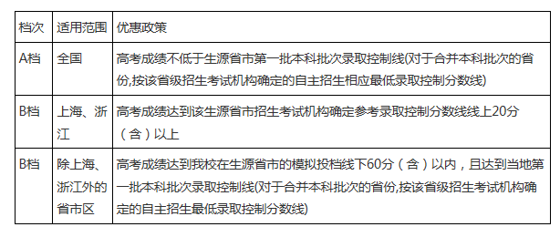 獲得我校自主招生認(rèn)定資格的考生,在高考自主招生志愿中填報(bào)我校及我校指定專業(yè),在高考錄取時(shí)可以享受下列優(yōu)惠政策,并按公示專業(yè)予以錄取: