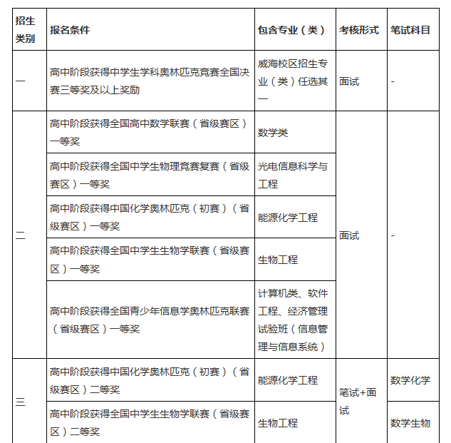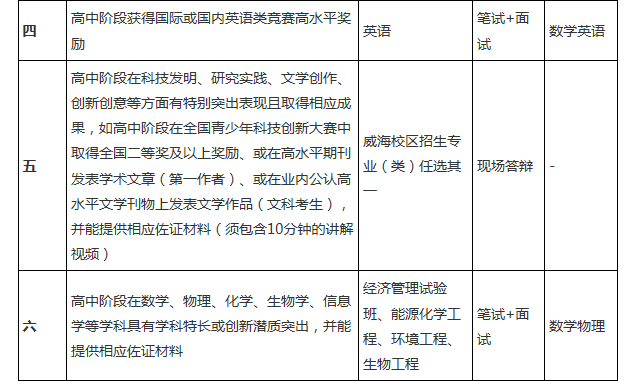 威海校區(qū)2017年自主招生類別、報名條件、包含專業(yè)(類)、考核形式及筆試科目見下表。