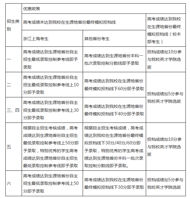 取得我校自主招生資格的考生必須參加高考,且高考成績達(dá)到生源地省份本科第一批次錄取控制分?jǐn)?shù)線上,可在自主招生指定志愿位置填報公示專業(yè),我校按如下錄取條件錄取: