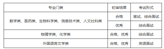 報考數(shù)學(xué)類、醫(yī)藥類、生物科學(xué)類、信息技術(shù)類、人文社科類初審結(jié)果為合格的考生筆試通過后方可參加綜合面試。