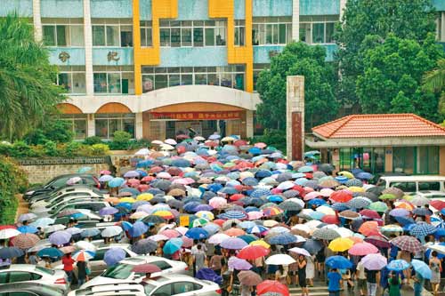 新學期開始了,校園又恢復(fù)了學生勤奮學習的朗朗讀書聲。然而,望子成龍的家長每天都關(guān)切牽掛著學生放學路途上的安全。圖為寶華路第五小學,微微秋雨家長校園舉傘接新生放學一景。