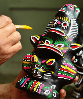 還有媒體報道說,泥泥狗的制作過程是與“女媧摶土造人”的神話故事一起流傳下來的。泥泥狗造型囊括了形形色色的奇禽異獸達200多種,造型古樸、粗獷、奇特,它用黑色著底,上面描著紅、黃、青、白線條,色彩鮮明艷麗,與《山海經(jīng)》記載的眾多神異,如出一轍,因此又被國內(nèi)外專家們譽為“真圖騰”、“活化石”。