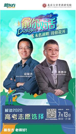 為了幫助考生科學(xué)填報(bào)志愿,合理規(guī)劃未來,7月13日20:00,新東方創(chuàng)始人俞敏洪將直播對(duì)話北京大學(xué)考試研究院院長秦春華,共同解讀2020高考志愿選擇,并為即將踏入大學(xué)校門的大一新生帶來學(xué)習(xí)規(guī)劃、人生發(fā)展、方向選擇等全方面的成長干貨。