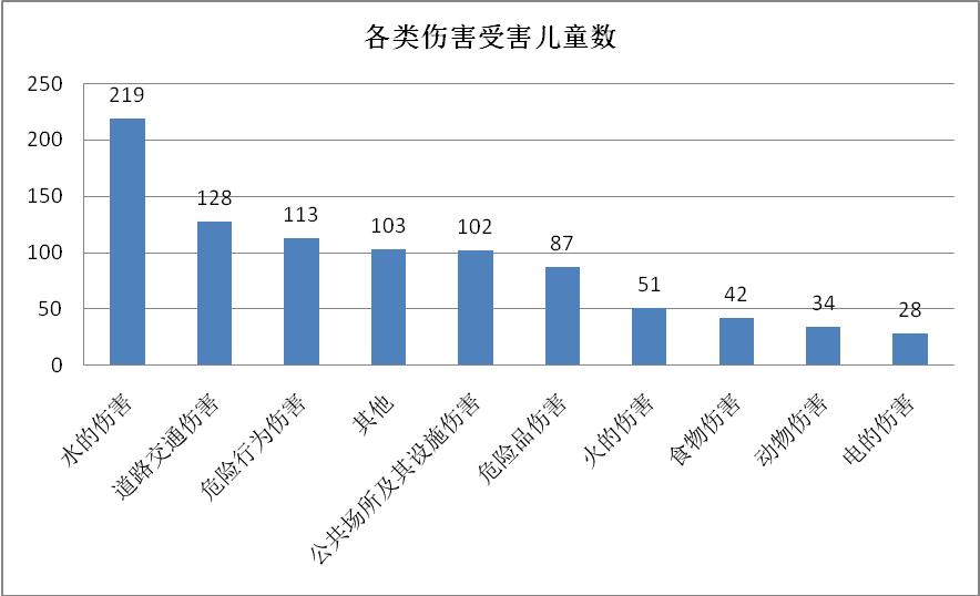 據(jù)告統(tǒng)計(jì),兒童傷害總?cè)藬?shù)為907人,其中死亡485人,占總數(shù)的53.5%。其中水的傷害、道路交通傷害、危險(xiǎn)行為傷害是造成兒童死亡人數(shù)最多的3類傷害,死亡人數(shù)占該類傷害受害人數(shù)比例分別達(dá)到75.8%、57.8%、55.8%。