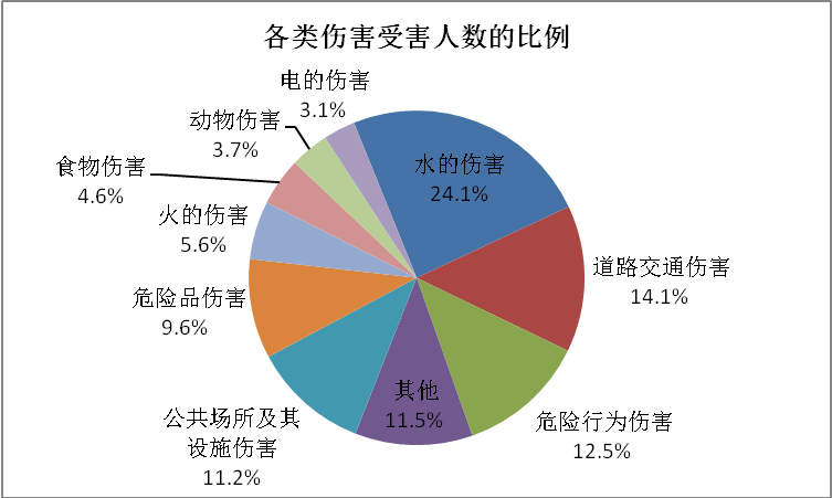在兒童意外傷害的類別上,報(bào)告顯示,隨著年齡增加,傷害逐漸向少數(shù)幾類集中,值得注意的是,每一個年齡段都存在受到水的傷害的情形,而且排名始終靠前?傮w數(shù)據(jù)顯示,受水傷害的兒童人數(shù)達(dá)219人,占受害兒童總數(shù)24.1%,遠(yuǎn)遠(yuǎn)高于其他兒童傷害。具體見下圖: