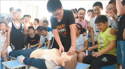 日前,江蘇省海門市實驗小學一名五年級學生正在體驗心肺復蘇法。江蘇省海門市組織消防、衛(wèi)生、電力等部門專業(yè)人員走進校園,開展系列安全知識宣傳活動,提高學生防范風險和應對突發(fā)事件的能力,確保學生安全快樂地度過暑假。