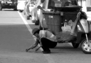 環(huán)衛(wèi)女工王明琴用手將瓜子皮一個(gè)一個(gè)摳起。