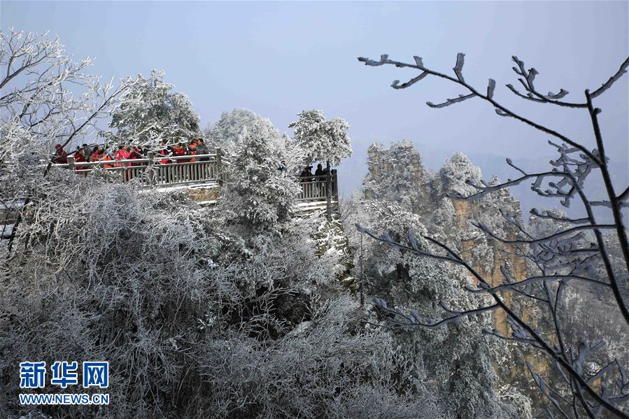 3月10日,游客在雪后的湖南張家界武陵源景區(qū)游覽。當(dāng)日10時(shí),中央氣象臺(tái)繼續(xù)發(fā)布寒潮藍(lán)色預(yù)警。受寒潮影響,浙江、江西、湖北、湖南、貴州等多地出現(xiàn)明顯大風(fēng)降溫和雨雪天氣。新華社發(fā)(吳勇兵 攝)
