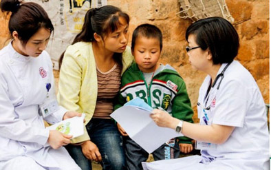 ▲賀醫(yī)生(右一)在湖南湘潭湘鄉(xiāng)市梅橋鄉(xiāng)為貧困白血病患兒看病(資料照片)。 新華社發(fā)