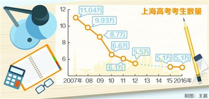 統(tǒng)計(jì)數(shù)據(jù)顯示,近幾年來,上海每年6月高考人數(shù)總體呈下降趨勢(shì)。2007年考生數(shù)量為11.04萬;2015年,本市高考考生數(shù)量為5.1萬。業(yè)內(nèi)專家分析,考生人數(shù)變動(dòng)的主要原因是適齡入學(xué)人口總量減少。就在幾年前,曾有預(yù)測(cè),上海高考人數(shù)將在2016年、2017年間迎來回升。對(duì)于這樣的說法,專家并不認(rèn)同。從上海高中入學(xué)情況來看,近三年數(shù)字保持平穩(wěn),并未出現(xiàn)較大波動(dòng)。