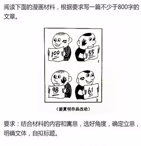 人民網(wǎng)北京6月7日電 2016年高考語文科目結(jié)束,據(jù)考生介紹,今年高考作文題為一組漫畫,內(nèi)容是一個小孩考試100分得到家長一個吻,98分卻挨了一巴掌;另一個小孩考試61分得到一個吻,55分挨了一巴掌。