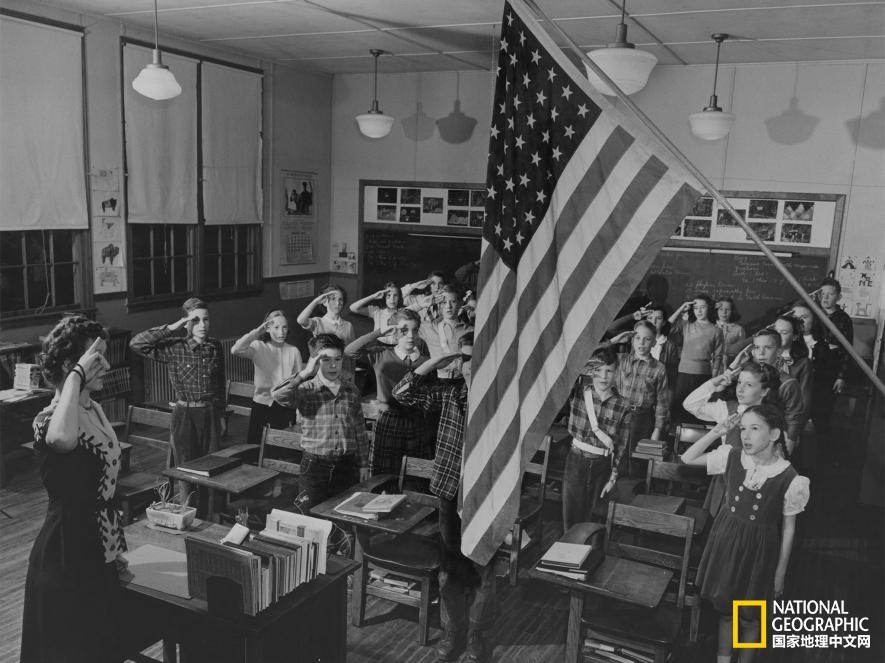 宣誓 | 在1948年的弗吉尼亞州亞歷山大市,查爾斯·巴雷特小學(xué)(Charles Barrett Elementary School)的某班學(xué)生在向旗幟敬禮的宣誓聲中開始了一天的課程。如今,絕大多數(shù)的美國(guó)人在面對(duì)國(guó)旗時(shí)是通過(guò)手扶胸前來(lái)敬禮,而不是照片中的手勢(shì)。