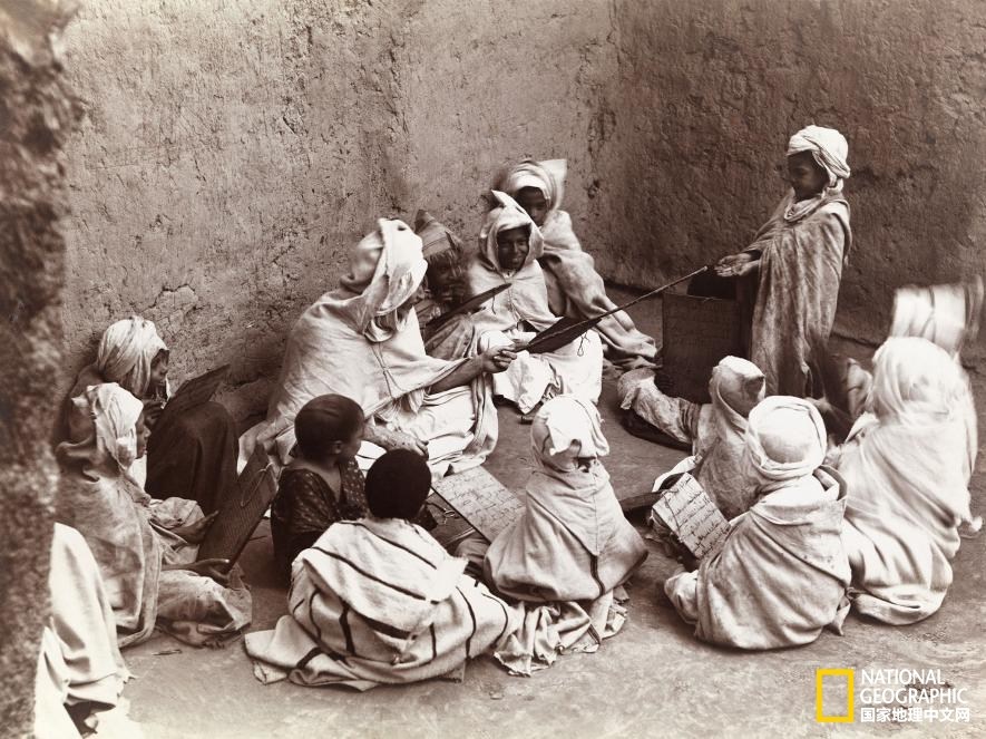 沙中亦有顏如玉 | 這是一張拍攝于突尼斯的老照片,刊登于1914年的《國(guó)家地理》雜志。開辦在撒哈拉沙漠里的學(xué)校正在講授書法課程。