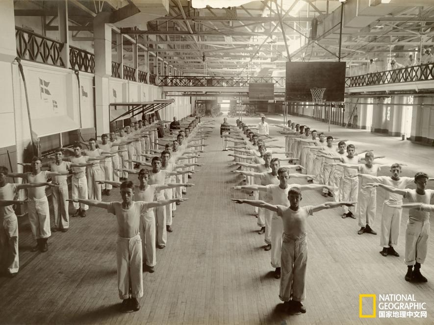 時(shí)刻準(zhǔn)備著 | 一戰(zhàn)時(shí)期的美國(guó)羅德島州,男孩們?cè)诩~波特(Newport)的一所海軍培訓(xùn)學(xué)校進(jìn)行訓(xùn)練。該照片刊登于1917年的《國(guó)家地理》雜志,它的配文仍鏗鏘有力:“唯有少年們擁有堅(jiān)實(shí)強(qiáng)健的臂膀,我們美國(guó)海軍才有信心與險(xiǎn)惡的德國(guó)潛艇一決雌雄。”