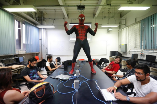 蜘蛛俠是不少學(xué)生黨心目中的英雄,但你想象過(guò)一個(gè)站在桌子上,給你教授計(jì)算機(jī)知識(shí)的蜘蛛俠嗎?墨西哥就有這樣一位“蜘蛛俠”,年僅26歲的大學(xué)老師莫伊塞斯突然靈感迸發(fā),穿著“蜘蛛俠”的紅藍(lán)緊身衣去給學(xué)生上課。