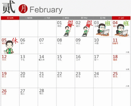 2月1日-2日為春節(jié)假期,共2天,2月4日(星期六)上班;