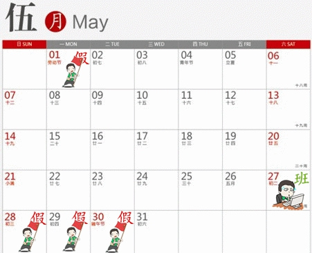 5. 端午節(jié):5月28日至30日放假調(diào)休,共3天。5月27日(星期六)上班。