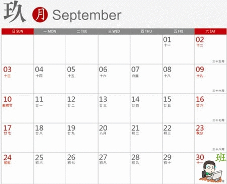 9月沒有法定節(jié)假日,9月30日(星期六)上班;