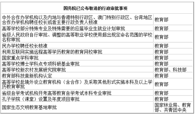取消的教育相關(guān)行政審批事項包括,中外合作辦學(xué)機(jī)構(gòu)以及內(nèi)地與香港特別行政區(qū)、澳門特別行政區(qū)、臺灣地區(qū)合作辦學(xué)機(jī)構(gòu)聘任校長或者主要行政負(fù)責(zé)人核準(zhǔn);高等學(xué)校部分特殊專業(yè)及特殊需要的應(yīng)屆畢業(yè)生就業(yè)計劃審批;省級人民政府自行審批、調(diào)整的高等職業(yè)學(xué)校使用超出規(guī)定命名范圍的學(xué)校名稱審批;民辦學(xué)校聘任校長核準(zhǔn);利用互聯(lián)網(wǎng)實施遠(yuǎn)程高等學(xué)歷教育的教育網(wǎng)校審批;國家重點學(xué)科審批;高等學(xué)校博士學(xué)科點專項科研基金審批;教育部科技查新機(jī)構(gòu)認(rèn)定;高等學(xué)校赴境外設(shè)立教育機(jī)構(gòu)(含合作)及采取其他形式實施本科及以上學(xué)歷教育審批;省級自學(xué)考試機(jī)構(gòu)開考高等教育自學(xué)考試本科專業(yè)審批;孔子學(xué)院(課堂)設(shè)置及年度項目審批;高等學(xué)校新農(nóng)村發(fā)展研究院審批;國家生態(tài)文明教育基地審批等。