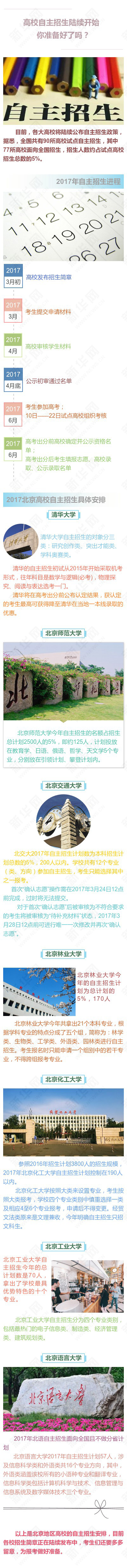 3月12日,北京交通大學(xué)和北京林業(yè)大學(xué)通過(guò)本科生招生網(wǎng)正式發(fā)布了2017年自主招生政策。從今日開(kāi)始,北京有自主招生資格的各大高校將陸續(xù)公布自主招生政策。北京大學(xué)和清華大學(xué)自主招生簡(jiǎn)章預(yù)計(jì)本月中下旬公布。