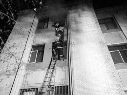 了解現(xiàn)場情況后,一組消防人員利用一部車及兩支水槍對樓層蔓延火勢進(jìn)行壓制,以防火勢進(jìn)一步蔓延,同時背負(fù)空氣呼吸器迅速進(jìn)入火場,進(jìn)行人員搜救活動;一組消防人員架設(shè)拉梯,分別從南北兩側(cè)營救窗臺上的求救人員。