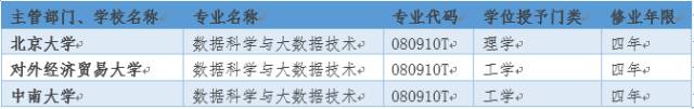 從兩次獲批的”數(shù)據(jù)科學(xué)與大數(shù)據(jù)技術(shù)專(zhuān)業(yè)”名單中可以看出,該專(zhuān)業(yè)學(xué)制都為四年,授予工學(xué)學(xué)位或理學(xué)學(xué)位。