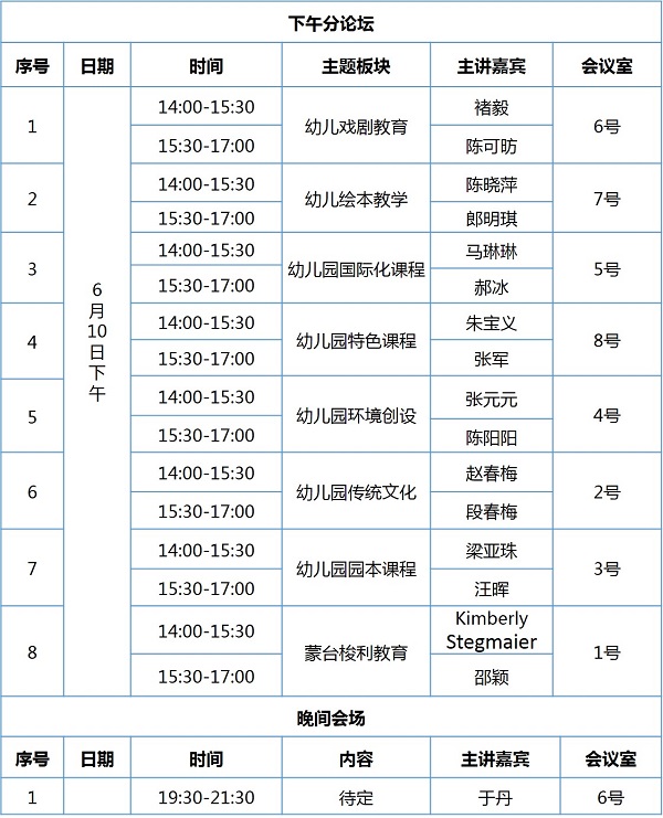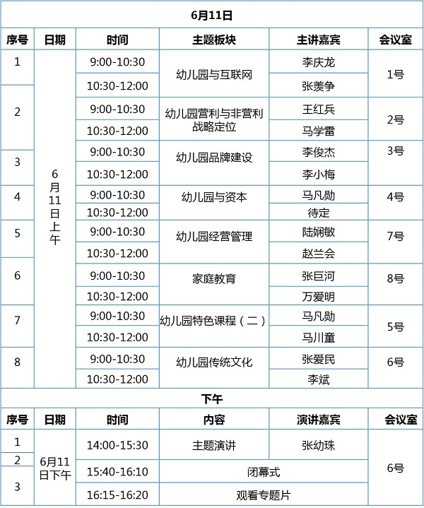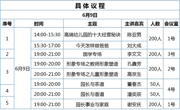 八、分論壇主題版塊:1.幼兒戲劇教育2.幼兒繪本教學3.幼兒國際化課程4.幼兒特色課程5.幼兒環(huán)境創(chuàng)設6.幼兒傳統(tǒng)文化7.幼兒園本課程8.蒙臺梭利教育9.幼兒園與互聯(lián)網(wǎng)10.幼兒園盈利與非營利戰(zhàn)略定位11.幼兒園品牌建設12.幼兒園與資本13.幼兒園經(jīng)營管理14.家庭教育