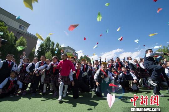 圖為5月23日,西藏航空飛行部成員與孩子們一起放飛紙飛機“播種飛行夢”。 何蓬磊 攝