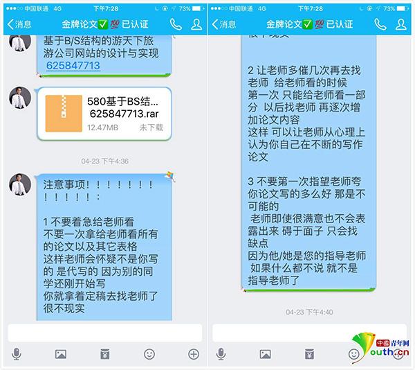 圖為張良提供聊天截圖。根據(jù)張良提供的信息,記者也添加了“金牌論文”QQ,以學(xué)生身份與其交涉,提出想做一套“在線點餐系統(tǒng)”的畢業(yè)設(shè)計!敖鹋普撐摹痹偃儐栍浾咚诘膶W(xué)校,而后透露他們的論文是買一套刪一套,絕對避免重復(fù),論文及畢業(yè)設(shè)計保證“自己原創(chuàng),獨一無二”。“金牌論文”告訴記者,一般在淡季訂單少時,完成新的論文;旺季時拿來賣,且論文寫作團(tuán)隊都是碩士和博士文憑。