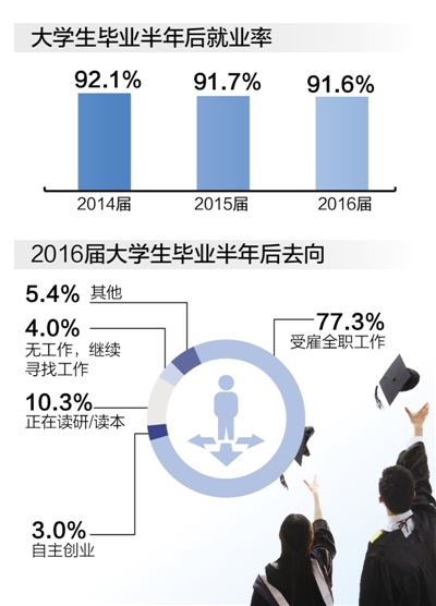 第一,大學(xué)畢業(yè)生就業(yè)率總體穩(wěn)定。關(guān)于大學(xué)生畢業(yè)半年后的就業(yè)率與2016屆大學(xué)生畢業(yè)半年后去向的具體數(shù)據(jù)見右圖。