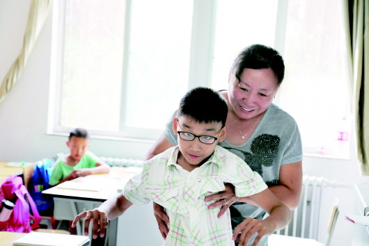 在媽媽的照顧下,于卓群的課間活動已不成問題,但也有尷尬的時候。比如上廁所,剛開始,王莉背著兒子到男廁所,同學(xué)們見進來一個女的,都一哄而散。后來,她又試著將兒子背到女廁所,但兒子死活都不干。最終,王莉只有等到大家都上課了,才帶著兒子去上廁所。