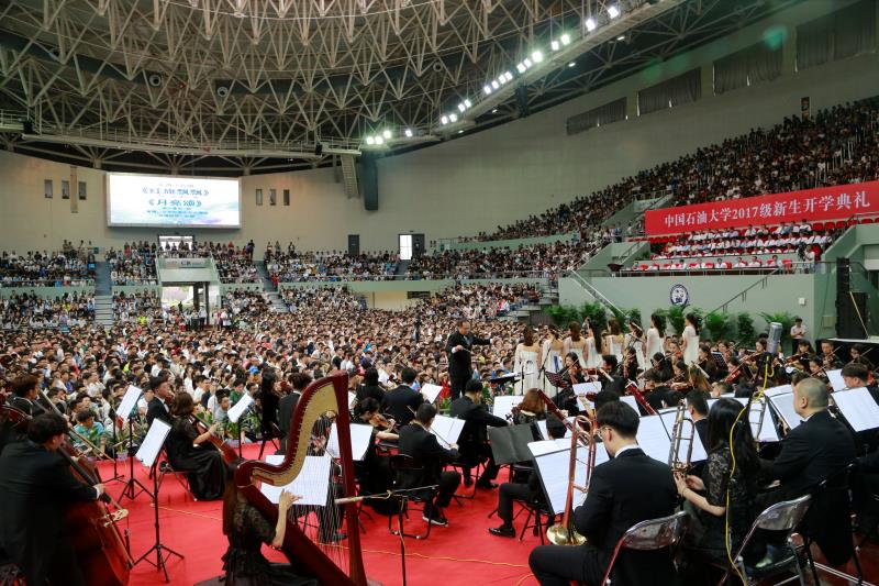 國(guó)家一級(jí)指揮徐學(xué)敏擔(dān)任指揮,中國(guó)石油大學(xué)勝華交響樂(lè)團(tuán)和中國(guó)石油大學(xué)合唱團(tuán),共同為2017級(jí)新生們演出了校歌《北京石油學(xué)院學(xué)生之歌》以及《黃河大合唱》、《梁!返戎型饷。