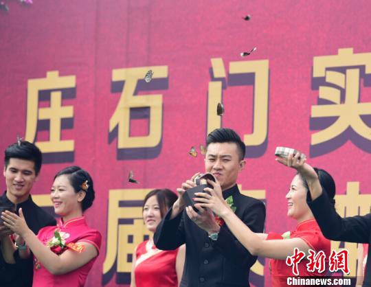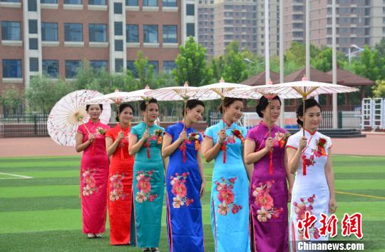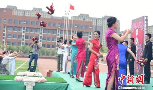 河北石家莊石門實(shí)驗(yàn)學(xué)校10日上午舉辦第三屆集體婚禮獻(xiàn)禮教師節(jié);槎Y儀式上,新娘們身著旗袍,新郎們身著中山服,分別從學(xué)校精心設(shè)置的“鵲橋”兩側(cè)入場(chǎng)。