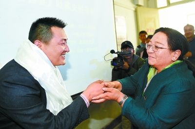 10月7日,三名西藏大學(xué)文學(xué)院在讀藏族博士生通過論文答辯,標(biāo)志著西藏即將迎來首批本土培養(yǎng)的藏族博士生。圖為博士生導(dǎo)師強(qiáng)俄巴·次央教授(右)向通過答辯的索朗次仁祝賀。