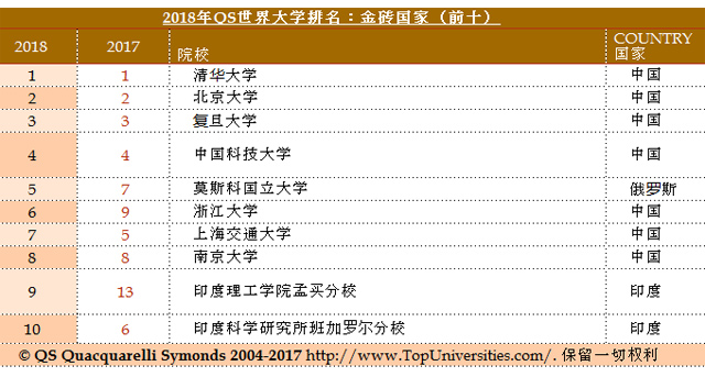 榜單中,排在前十位的學(xué)校,有七所是中國(guó)的大學(xué)。本次總共有300所大學(xué)參與排名,其中94所是中國(guó)大學(xué),68所來(lái)自俄羅斯,印度65所,巴西61所,南非12所。
