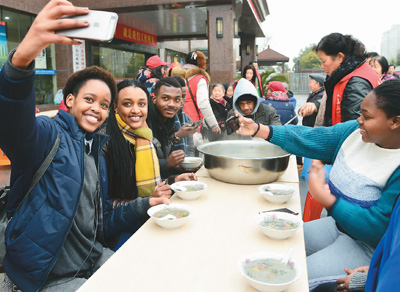 臘八節(jié)前夕,1月22日,來(lái)自巴基斯坦、牙買加、埃塞俄比亞等國(guó)的江蘇大學(xué)留學(xué)生走進(jìn)鎮(zhèn)江市和平路街道金山水城社區(qū),與社區(qū)居民一起制作、品嘗臘八粥,感受中國(guó)傳統(tǒng)文化。圖為留學(xué)生與臘八粥“合影”。