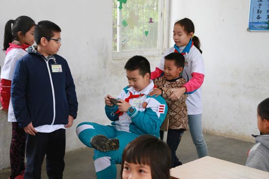 廣東省廣州市的小學(xué)生到廣東清遠(yuǎn)的山村小學(xué)支教,為山村留守兒童上網(wǎng)絡(luò)安全課。圖為“小講師”們演出情景劇模擬孩子們玩游戲時(shí)的不良姿勢(shì),讓學(xué)生們糾正。趙暉/攝