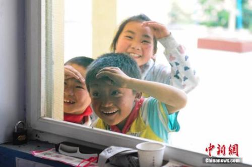 資料圖:兒童節(jié),3名學生與老師玩捉迷藏游戲,偷看老師行蹤。中新社記者 張勇 攝