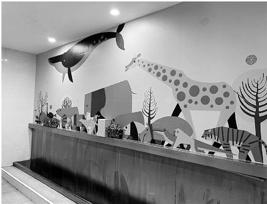 這是一間男生廁所,藍(lán)色系的背景墻上,各畫了一只長(zhǎng)頸鹿和一條鯨魚,底部還有大象、熊貓等卡通形象。廁所隔間的門板上,也是同系列的兒童畫。