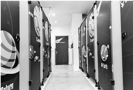 同行的女同事,去逛了下旁邊的女廁所,畫面又迥然不同。畫的是科技主題,以女生喜歡的紫色偏暖色調(diào)為主,只見墻上添加了不少火箭、星球的簡(jiǎn)筆畫浮雕裝飾,整體感覺更加溫馨。
