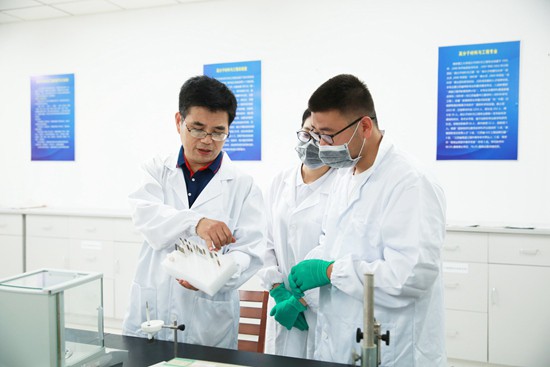 朱緒飛教授(左)指導(dǎo)學(xué)生做實(shí)驗(yàn)。圖片由朱緒飛提供