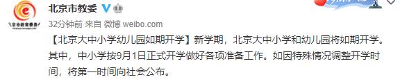 央廣網北京8月18日消息(記者王紅霞)記者從北京市教委官方微博獲悉,新學期,北京大中小學和幼兒園將如期開學。其中,中小學按9月1日正式開學做好各項準備工作。如因特殊情況調整開學時間,將第一時間向社會公布。